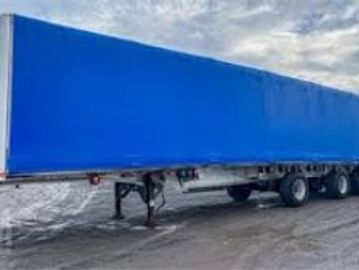 This flatbed is 102" (8.5 ft) wide. Conestoga's open from each end and can carry the same materials a regular flatbed trailer can hold. This 3 axle model can handle heavy loads.